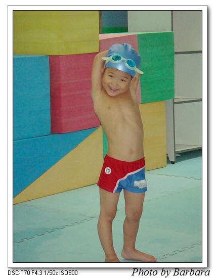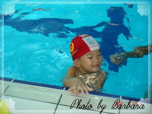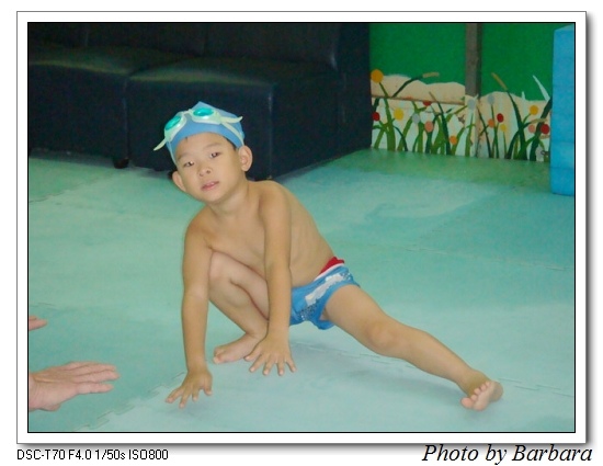 話說星期四早上帶著小恐龍上游泳課,當天天氣晴朗,還有點熱,正是個適合下水的好日子。芭芭拉早早出門,到游泳學校的時間還早,外面一整排空車位,找都不用找。想來改成週間上課的確是正途。 先到櫃台拿上次忘了帶回家的上課證,換好泳衣到池邊。真的是還早,池邊空盪盪的沒半個人,池子裡只有幾個上了年紀的歐里桑歐巴桑在游泳,就連教練都還沒換衣服哩。問小恐龍要不要先去小池玩溜滑梯,他搖頭說不要,只要坐在一旁看人家游就好了。 喜歡小恐龍的教練過來打招呼,問小恐龍怎麼不先去玩玩?芭芭拉看時間還早,空坐著也沒意思,就還是勸說小恐龍先去玩。 溜了幾次,原本一副沒睡醒的小恐龍high了起來,玩得欲罷不能。無奈上課時間到了,教練呼喚大家集合做操。芭芭拉要小恐龍自己從扶梯上岸,他不走距離比較近的這一個,偏偏要走另一端。好吧,就是愛玩嘛,芭芭拉也就依他了。問題是他又回頭要芭芭拉別跟著他:「我走這邊,媽咪妳走那邊!」開玩笑,雖然水深只及膝,對小恐龍來說也不到胸口,可是芭芭拉怎敢讓他自己走過半個池子?