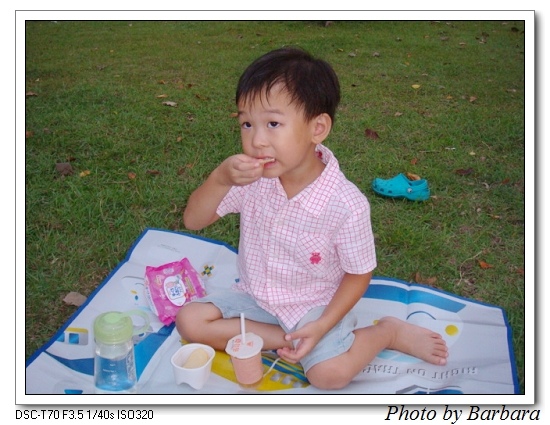 蛤?野餐這個詞是什麼時候跑進這個四歲半的腦袋裡的?「現在太熱了啦,下午再去好了。」 中午出門吃飯,又去大賣場補貨,回到家後,小恐龍不忘野餐之約,一直催促芭芭拉和老丹出門。一時之間哪變得出什麼野餐食物啊,為了交差,芭芭拉只好拿了幾包零食、飲料,得到少爺的首肯,出門野餐去。臨出門前,少爺還不忘交待要帶「野餐的布」。