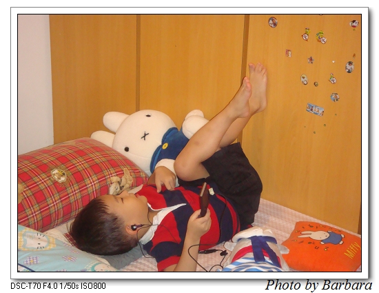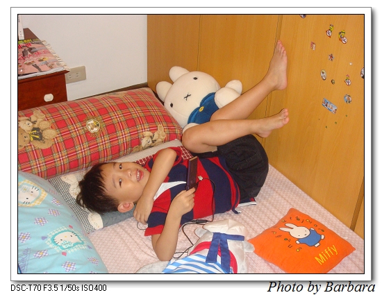 這陣子鬧彆扭,怎樣都不肯讓人好好照相。那天芭芭拉拿出照相機,照例拍到一個蒙頭蒙臉,一副躲狗仔樣的小鬼。